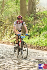 Nu, met de Paterberg was het zwaarste van de hellingen nog niet voorbij. De befaamde Koppenberg kwam al snel in zicht. Zelf had ik deze dit jaar al 2 keer opgereden. De eerste keer in de regen, de laatste keer in iets betere omstandigheden. Toen was het droog. Ook deze keer waren de weersomstandigheden geen spelbreker, zelfs niet de massa die de Ronde met zich meebrengt. Op een tikkeltje reserve (al moest het niet meer zijn of ‘k stond stil), reed ik naar boven. Na korte tijd kwam ook Eddy boven, al had hij ’t steilere stuk te voet moeten doen.