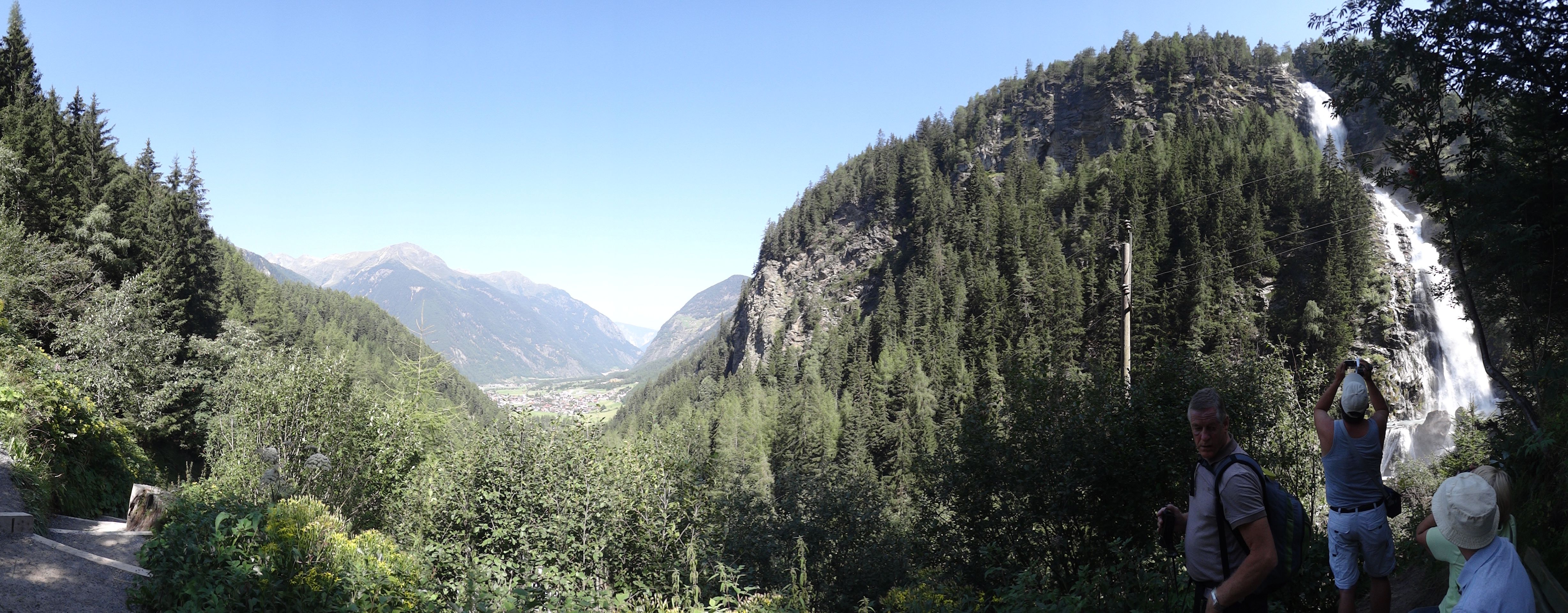 De wagen werd geparkeerd aan de parking van het Otzi-dorp, een dorp uit de tijd van Otzi. Van daaruit was het nog zo’n 40 minuten wandelen volgens de bordjes. Over het parcours wisten we eigenlijk niets. Het was richting de voet van de waterval, maar dat was alles behalve vlak. Amai! Het pad liep bij momenten erg omhoog. Af en toe even een rustpauze nemen was de boodschap. Want we wouden er geraken.
